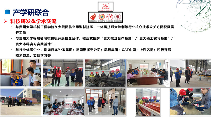 貴州貴材是一家注重知識(shí)產(chǎn)權(quán)保護(hù)和核心技術(shù)投入的國(guó)家高新技術(shù)企業(yè),企業(yè)于2018年1月正式成立研發(fā)中心,專(zhuān)注于行業(yè)產(chǎn)品的核心技術(shù)攻關(guān)。中心多次利用企業(yè)自身生產(chǎn)技術(shù)積累優(yōu)勢(shì)和廣闊銷(xiāo)售渠道來(lái)積極推廣自身科技成果轉(zhuǎn)換。與貴州大學(xué),貴州理工大學(xué)等知名院校專(zhuān)家在型材原材料,工業(yè)模具設(shè)計(jì),型材生產(chǎn)工藝,終端消費(fèi)品開(kāi)發(fā),航空用鋁鋰合金生產(chǎn)研發(fā)等行業(yè)領(lǐng)域合作研究開(kāi)發(fā)多項(xiàng)科技項(xiàng)目。2021年4月,貴州貴材與貴州大學(xué)機(jī)械工程學(xué)院正式簽署校企合作協(xié)議,雙方利用自身優(yōu)勢(shì)在鋁工業(yè)領(lǐng)域積極展開(kāi)技術(shù)攻關(guān)和人才交流互動(dòng)。同時(shí)企業(yè)引進(jìn)先進(jìn)科技成果并實(shí)施轉(zhuǎn)換,取得較好的用戶(hù)體驗(yàn)和經(jīng)濟(jì)效益