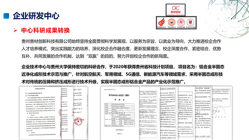 貴州貴材是一家注重知識產(chǎn)權保護和核心技術投入的國家高新技術企業(yè),企業(yè)于20181月正式成立研發(fā)中心,專注于行業(yè)產(chǎn)品的核心技術攻關。中心多次利用企業(yè)自身生產(chǎn)技術積累優(yōu)勢和廣闊銷售渠道來積極推廣自身科技成果轉換。與貴州大學,貴州理工大學等知名院校專家在型材原材料,工業(yè)模具設計,型材生產(chǎn)工藝,終端消費品開發(fā),航空用