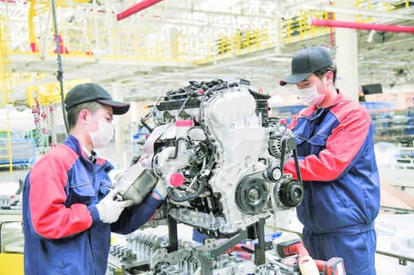 圖為貴州吉利汽車工作人員安裝汽車發(fā)動機(jī)。 王明元 攝