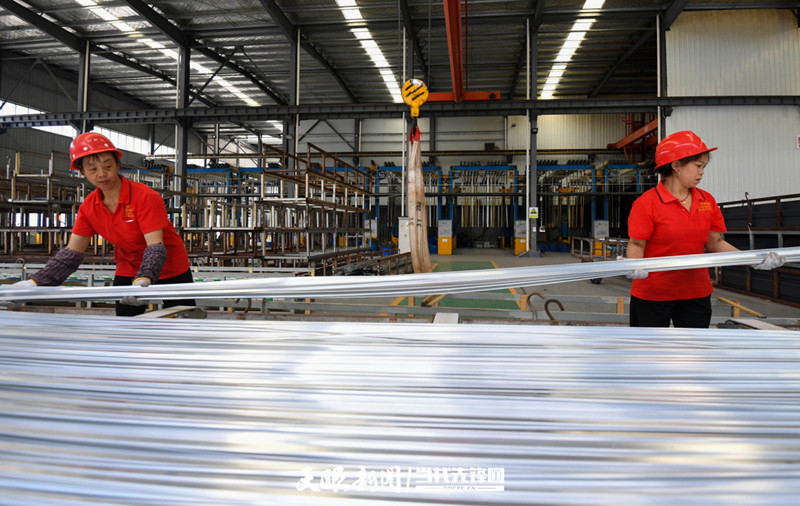 ??切割、校直、打包......8月初,記者走進位于貴陽國家經(jīng)濟技術開發(fā)區(qū)花冠路的貴州貴材擠壓車間,現(xiàn)場一片繁忙景象。一根根長約6米的鋁棒被叉車叉上擠壓機,通過鋁棒加熱爐軟化,由模具擠壓后變成半成品,再經(jīng)過氧化或噴涂就可以銷往市場。