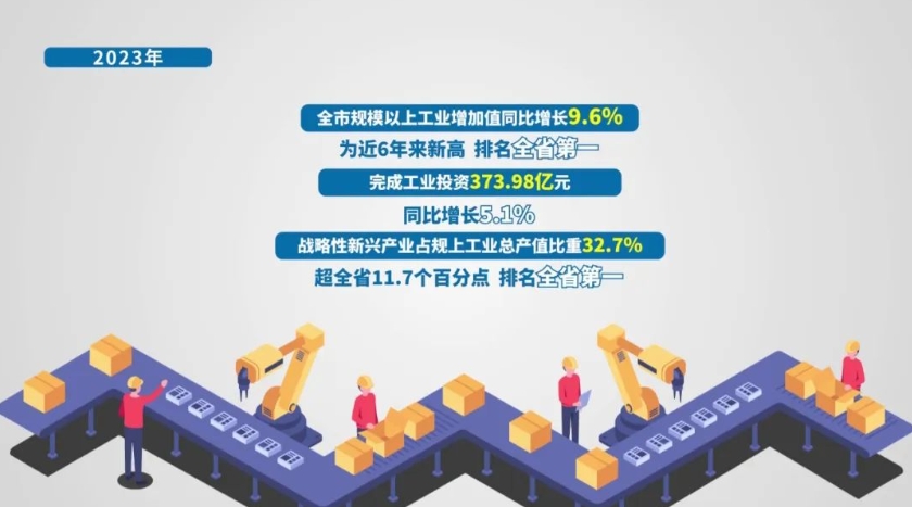 一組數(shù)據(jù)振奮人心:2023年,全市規(guī)模以上工業(yè)增加值同比增長9.6%,為近6年來新高,排名全省第一;完成工業(yè)投資373.98億元、同比增長5.1%,戰(zhàn)略性新興產(chǎn)業(yè)占規(guī)上工業(yè)總產(chǎn)值比重32.7%,超全省11.7個(gè)百分點(diǎn),排名全省第一。